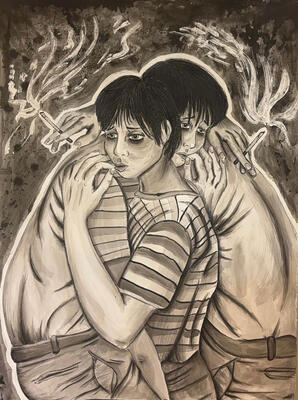 "Who Is This Diva?" is an ink drawing that explores themes of identity, self-perception, and self-soothing. The image of two identical women embracing—at once holding each other and themselves—reflects the complexity of inner dialogue and the ways we care for ourselves in moments of vulnerability. Through bold lines and mirrored forms, the piece questions where confidence ends and comfort begins, blurring the line between duality and unity. It’s both a portrait of self-love and a quiet inquiry into who we are when we strip everything else away.