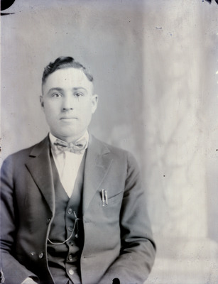 Portrait of a man who is seated and looking at the camera. He is wearing a dark colored 3-piece suit with a light colored shirt and a bow tie. He has a pocket watch and a pen in his breast pocket.
