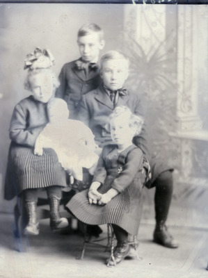 This is a photo of five children, presumably siblings. There are two girls who are seated and wearing dark colored dresses with pleated skirts. Two boys are wearing dark suits with large bow ties. There is an infant being held by the oldest girl. The oldest girl and boy are seated on a wooden bench. The younger girl is seated in an ice cream parlor chair and the youngest boy is standing between the two older children. Louis Koch paid for this photo.