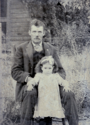 This photo was taken outdoors in front of a house and with a barbed wire fence just behind the subjects of the photo. There is a man wearing a three piece suit who is seated and standing in front of him is a little girl wearing a dress and a ribbon in her hair. Erma Hearn paid for this photo.