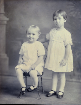Portrait of two young children. The youngest child is seated in an ice cream parlor chair on the left side of the photo. The older child, a girl is standing next to the chair with her right hand on the back of it. Both children are wearing white dresses. A.C. Schultz paid for this photo.
