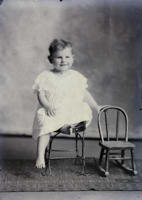 This is a portrait of a young child who is seated on an ice cream parlor chair wearing a white dress and no shoes. She is wearing a small necklace. The child has her left hand on a small wooden child's rocking chair sitting next to her. Mrs. Walter Snell paid for this photo.