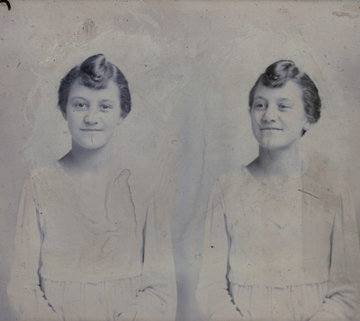 Two photos on one negative. These are portraits of a young woman who is seated and wearing a light colored dress. In the photo on the left she is looking directly at the camera. In the photo on the right he is looking to her right.
