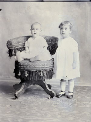 This is a portrait of two young children. The oldest is a little girl who is on the right and atanding. The younger child is seated on an unholstered chair that is covered with brocade and fringe. Both children are wearing white. M.D. Broadfoot paid for this photo.
