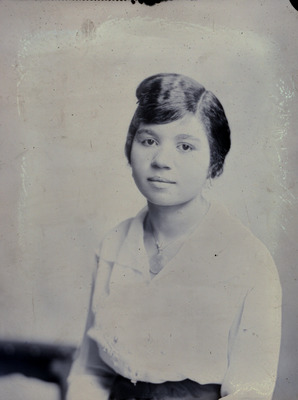 Portrait of a young African-American woman. She is seated turned slightly to her right and looking left toward the camera. She is wearing a white blouse, a dark skirt and a necklace