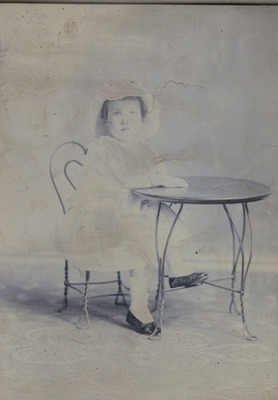 This is a photo of little girl who is seated at an ice cream parlor table on a matching chair. She is wearing a light colored dress and a hat, with dark shoes. Mrs. Penny paid for this photo.