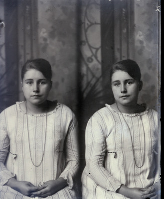 Two photos on one negative. This is a young woman who is seated in both photos. She is wearing a light colored stripped dress and a long necklace. She has her hands folded in her lap.