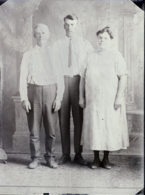 This is a group of three people - two men and one woman, who are standing. The man on the left is wearing dark pants a white shirt and suspenders. The man in the middle is wearing dark pants, white shirt and a tie. The woman is wearing a light colored dress.