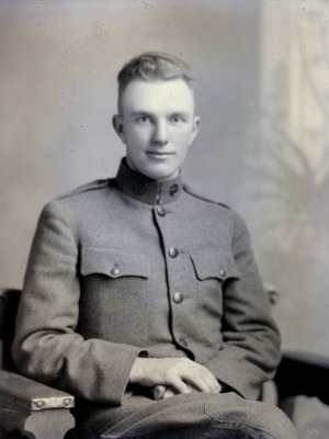 Portrait of a young soldier. The man is sitting in a wooden chair with his hands folded in his lap. He is wearing a WWI Army uniform, but no hat.