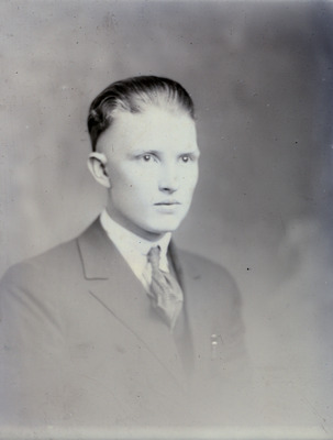 Portrait of a young man who is seated and wearing a dark colored suit, white shirt and a dark tie. The ledger indicates that he is a Macksville High School Senior