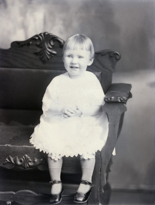 This is a photo of a little girl who is seated on a wooden bench with her hands in her lap. She is wearing a white dress, black patent leather shoes and stockings. Oscar Miller paid for this photo.