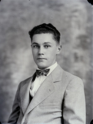 This is a portrait of a young man who is wearing a light colored suit, white shirt and a dark colored bowtie. The ledger indicates that this is a "Senior" photo.