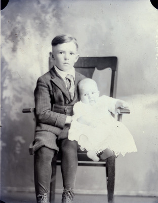 This is a photo of two children seated in a wooden arm chair. The oldest child is a boy who is wearing a dark colored suit, with short pants and a tie. He is supporting a baby who is wearing a white dress. Mrs. Ridgeway paid for this photo.