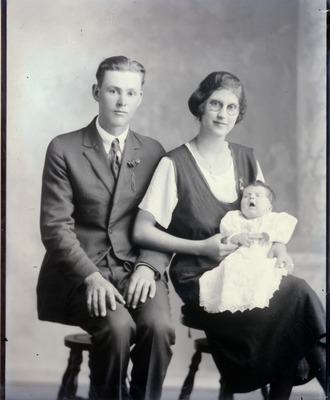 This is a family photo of a young father and mother, seated on wooden swivel stools. The man is wearing a dark colored suit and tie and the woman is wearing a dark colored jumper over a white blouse. The mother is holding a young infant who is wear a white dress.