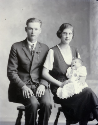 This is a family photo of a young father and mother, seated on wooden swivel stools. The man is wearing a dark colored suit and tie and the woman is wearing a dark colored jumper over a white blouse. The mother is holding a young infant who is wear a white dress.