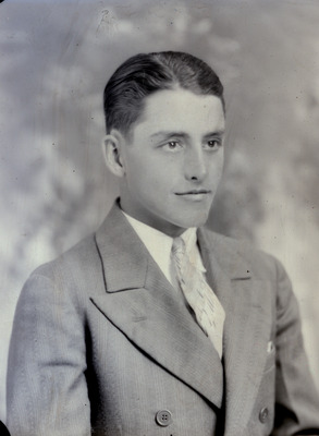This is a portrait of a young man who is wearing a light colored suit, white shirt and patterned tie. The ledger indicates that he is a High School Senior.
