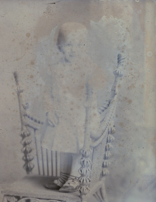 This is a photo of a young child who is standing on a wicker corner chair. The child I wearing a white dress and the ledger indicates his name is Herbert. Adolf Schade paid for this photo.