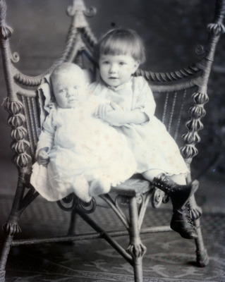 This is a photo of two children who are seated in a wicker corner chair. The older child, on the right is helping to hold the younger who is an infant. Both are wearing white dresses. Roy Clowes paid for this photo.