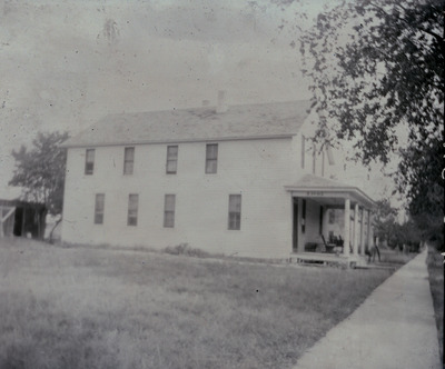This is a photograph of a large, two-story wood-framed house. The photo is taken from the side of the house. It has a large front porch and at least one out-building in the back.
