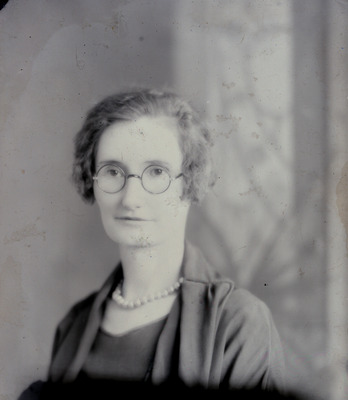 This is a portrait of a woman wearing a dark outfit with a white pearl necklace. She is also wearing round-rimmed glasses.