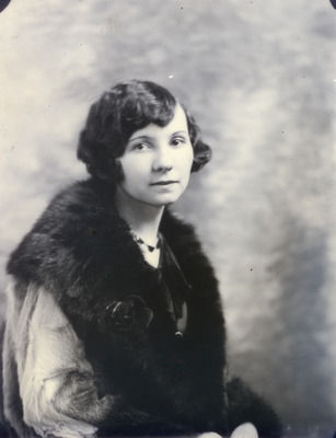 Portrait of a young woman who is seated and wearing a light colored fur coat with a very large dark colored fur collar. The ledger has the name of Cecil Jordan in parentheses.