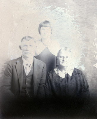 Older an and woman seated and wearing dark colored clothing. Daughter, Georgie is standing behind and between them and wearing a dark colored dress with a white collar.