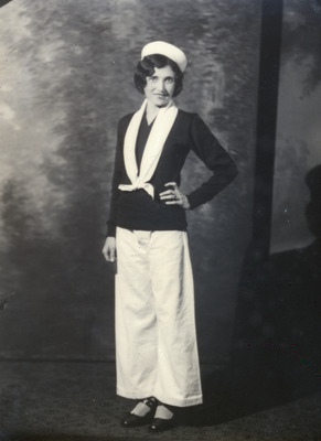Young woman who is standing and wearing a dark shirt, white pants and "sailor tie and hat". The ledger indicates that she is "in uniform".