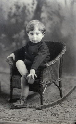 This is a photo of a young child, dressed in dark outfit and seated in a wicker child's rocking chair. Mrs. Fred Shultz paid for this photo.