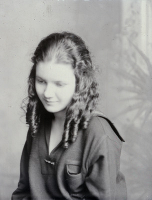 Portrait of a young woman who is seated and wearing a "sailor" blouse. She has her hair done in long sausage curls and is looking downward.