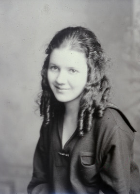 Portrait of a young woman who is seated and wearing a "sailor" blouse. She has her hair done in long sausage curls.