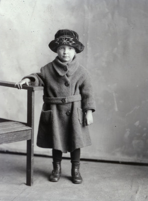Photo of a little girl who is standing next to a wooden chair with her right hand on the chair. She is wearing a dark colored winter coat and a dark hat. Harvey H. Smith paid for this photo.