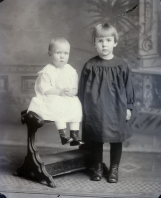 Photo of two children. A baby is sitting on a wooden bench, wearing a white dress. Standing on the right is a little girl wearing a dark colored dress. Fred Wall paid for this photo.