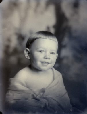 Portrait of a young child who is seated. The child appears to be wearing nothing except a blanket draped around the shoulders. Mr. Gray's ledger indicates the child's name is Billie. Dessie Davison paid for this photo