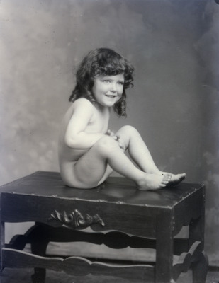 This is a portrait of a little girl with long sausage curls. She is nude and sitting on a wooden table. Everett E. Selfrage paid for this photo.