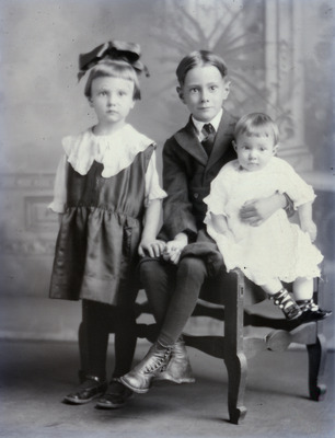 This is a photo of three children. The oldest, a boy is seated on a wooden bench and wearing a dark suit, white shirt and tie. He is holding a toddler who is wearing a white dress. Standing on the boy's right is a little girl wearing a dark dress with a white collar and sleeves and a large bow in her hair. W.R. Wilcox paid for this photo.