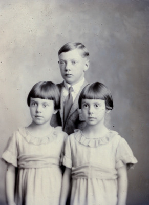 This is a photo of three siblings. An older boy stands in the back in the middle. He is wearing a medium colored suit, white shirt and a dark tie. Twin sisters stand in front of him. They are wearing identical light colored dresses with ruffled collars and belted waists.