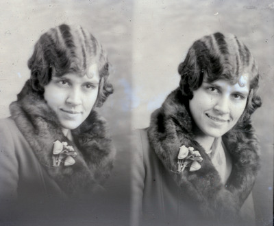 Portrait of a woman. She is wearing a winter coat with a fur collar. Pinned to the collar is a small corsage. There are two poses on one negative.