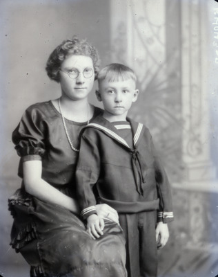 Photo of a young woman and a boy. The woman is seated and wearing a dark colored dress with a pearl necklace. The boy is wearing a dark "sailor" suit and standing in front of her.