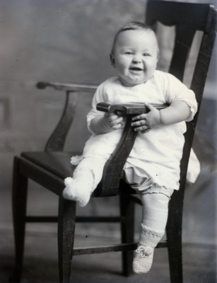 This is a photo of a baby, seated in a wooden chair with one leg through the arm of the chair. The child is wearing a white dress. Mrs. C.A. Satterlee paid for this photo.