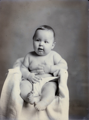 This is a photo of a baby, seated in a high chair that is covered by a white blanket. The baby is wearing only a diaper. Mrs. C.A. Satterlee paid for this photo.