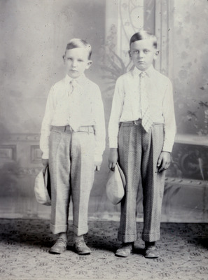 This is a photo of two young boys who are standing side-by-side. They are both wearing light colored cuffed trousers and white shirts with ties. Both are holding caps in their right hands. W.E. Willer paid for this photo.