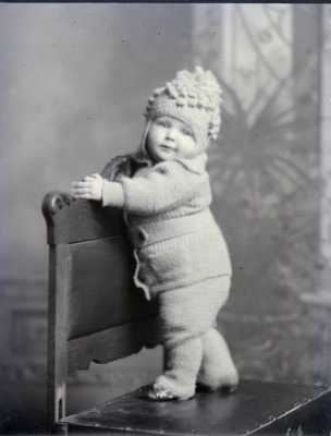 This is a photo of a baby who is standing on a wooden chair and holding on to the back of the chair. The child is wearing a knit winter outfit including long pants, coat and a hat. F.E. Huffman paid for this photo.