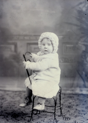 Photo of a baby who is seated backward on an ice cream parlor chair with one leg through the back of the chair. The child is wearing a white coat and bonnett. Frank Long paid for this photo.
