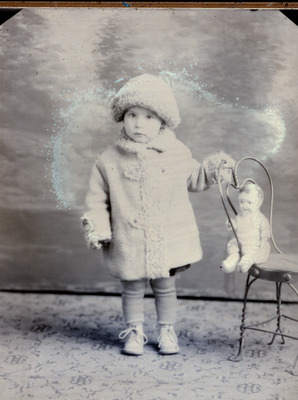 Photo of a toddler who is standing next to an ice cream parlor chair. A baby doll is sitting on the chair. She is wearing a winter coat and hat. The ledger indicates that the girl was one year old on 1/30/1929. Earl Toland paid for this photo.