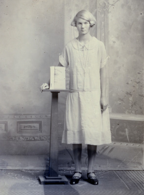Portraits -- Women -- Girls -- 1920-1930 -- Stafford County (Kan.), Clothing and dress, wooden furniture, diplomas, Bonnie Snell