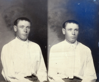 There are two poses on one negative of a man who is seated. He is wearing a white shirt with a light colored tie and dark trousers.