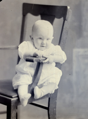 This is a photo of a baby who is seated on a wooden chair with one leg through the arm of the chair and both arms grasping the chair. The child is wearing a white dress. W.J. Milton paid for this photo.
