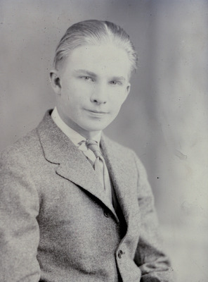 Portrait of a young man who is seated and turned slightly to his left. He is wearing a light colored suit and tie and a white shirt. Jessie Harrison paid for this photo.