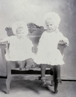 This is a photo of two little girls seated on a wooden chair. Both girls are wearing white dresses and bonnets. H. Hamilton paid for this photo.