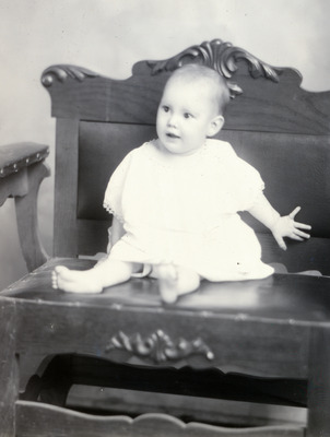 This is a photo of a baby who is seated ona wooden arm chair and wearing a white dress. Oscar Robinson paid for this photo.